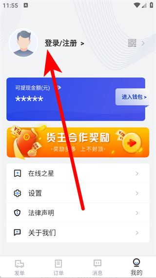 2、在我的页面,点击登录注册,进入注册登录页面。