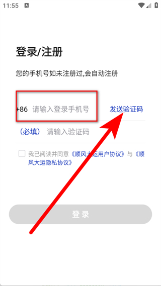 3、在注册登录页面,输入手机号后,点击发送验证码。