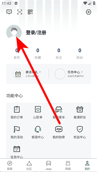 2、在我的页面,点击登录注册头像,进入注册登录页面。