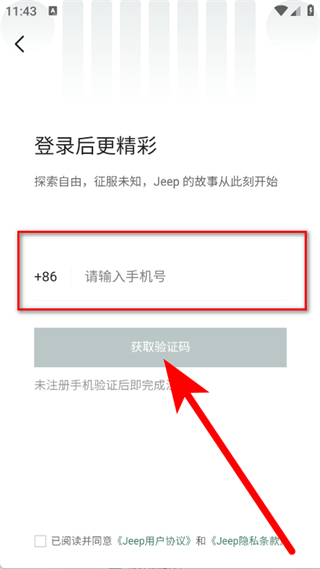3、在注册登录页面,输入手机号后,点击获取验证码。