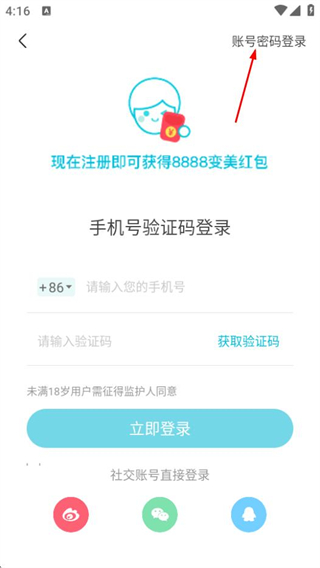 2、在登录页面,点击右上角账号密码登录选项,切换到账号密码登录界面。