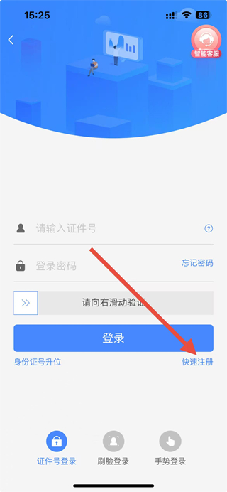 2、在个人相关页面,点击快速注册选项,进入注册信息填写页面。