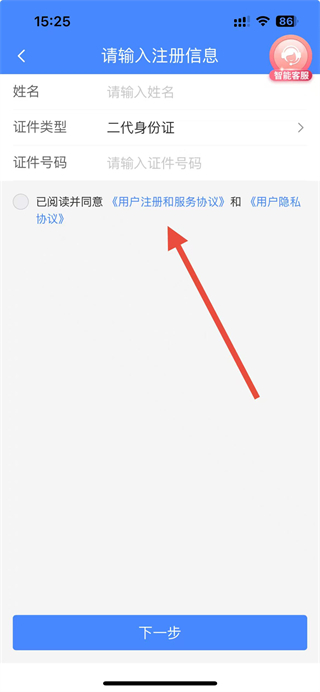 3、在注册信息填写页面,输入姓名、证件号码,勾选同意相关协议后点击下一步,按照提示完成账号注册。