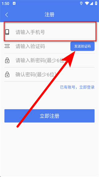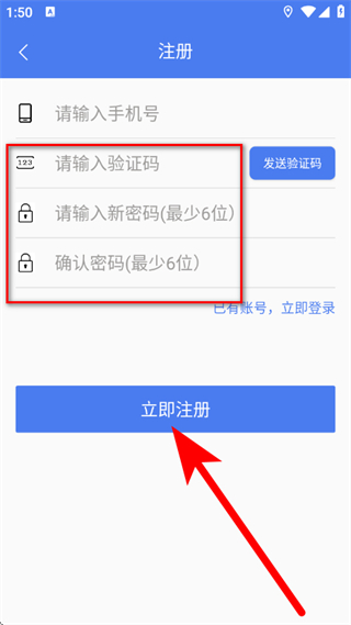 4、输入验证码、设置新密码,点击立即注册按钮,完成账号注册。