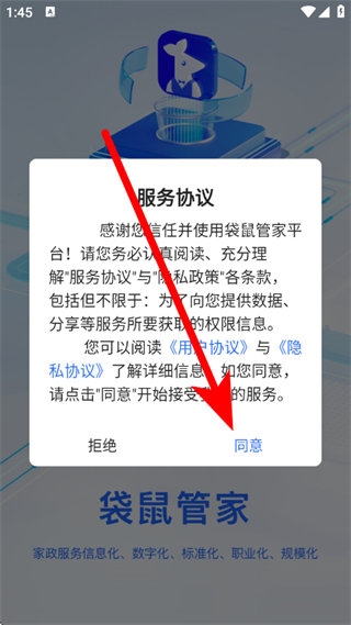 1、打开袋鼠管家平台,在弹窗中点击同意。