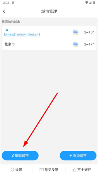 2、在城市管理页面,点击下方编辑城市选项按钮。