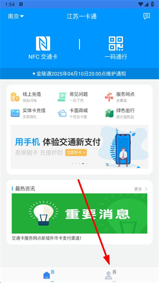 1、打开江苏一卡通app,点击右下角我选项,进入个人页面。