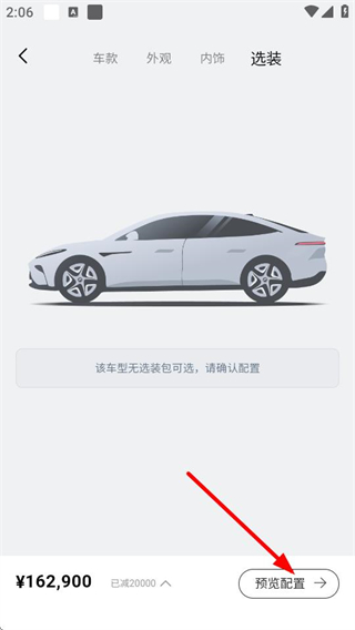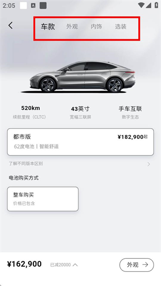 3、在配置页面可选择车款、外观、内饰、选装等进行配置。