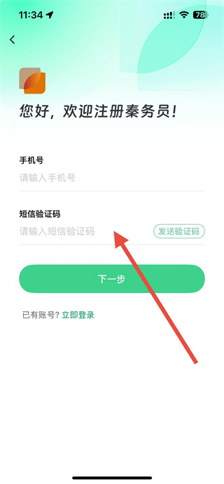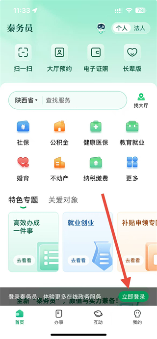 1、打开秦务员app,在首页点击立即登录按钮,进入登录页面。