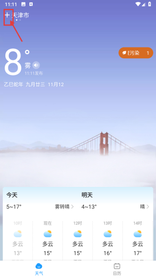 1、打开天气类APP,点击+号区域,进入城市管理页面。