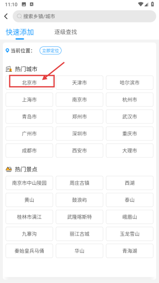 3、在快速添加页面,点击北京市选项,进入北京市天气页面。