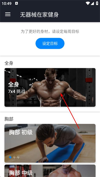 1、打开无器械在家健身APP,选择全身挑战训练项目。