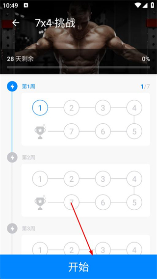 2、在训练计划页面点击开始,进入第1周第1天的训练安排。
