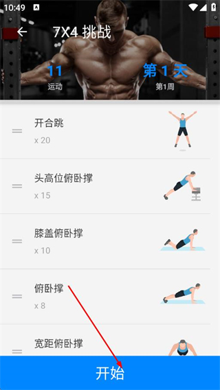 3、在训练内容页面点击开始,依次进行开合跳、头高位俯卧撑等动作。