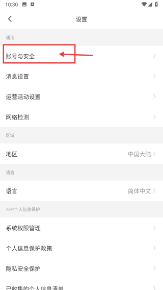 3、在设置界面,点击账号与安全选项,进入账号与安全页面。