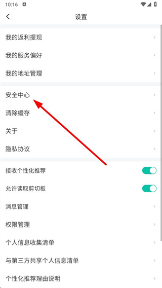 3、在设置页面,点击安全中心选项,进入账号与安全页面。