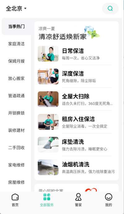 2、成功登录后进入软件首页,在首页的位置可以看到许多的家政服务选项,保洁清洗、家电清洗、放心搬家等服务应有尽有;