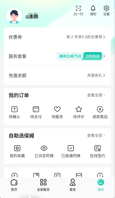 5、点击我的选项能够在里面看到自己的一些信息内容,账号的充值余额、订单信息以及自助选保姆等功能。