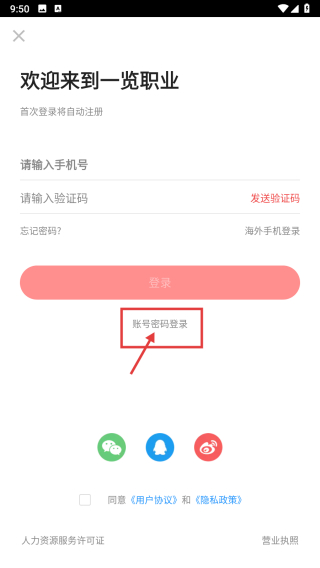 3、在登录选择界面,点击账号密码登录选项,进入账号密码登录页面。