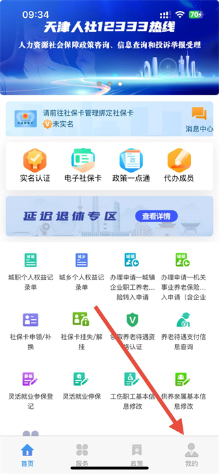 1、打开天津人力社保app,点击右下角我的选项,进入个人页面。