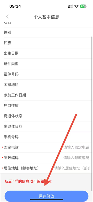 3、在个人基本信息页面,对可编辑的信息项进行修改,修改完成后点击保存修改按钮完成个人信息编辑。
