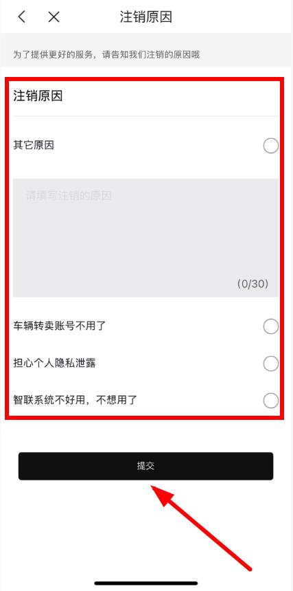 4、在弹出的注销原因选择界面中,选择注销原因后点击提交,按照提示完成后续操作即可完成账号注销。