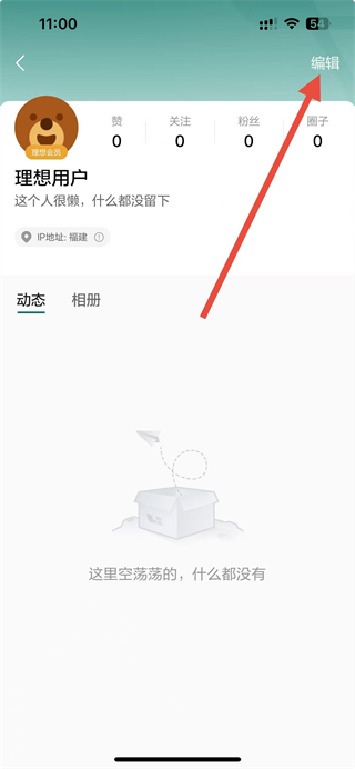 3、在个人主页,点击右上角编辑按钮,进入个人资料页面。