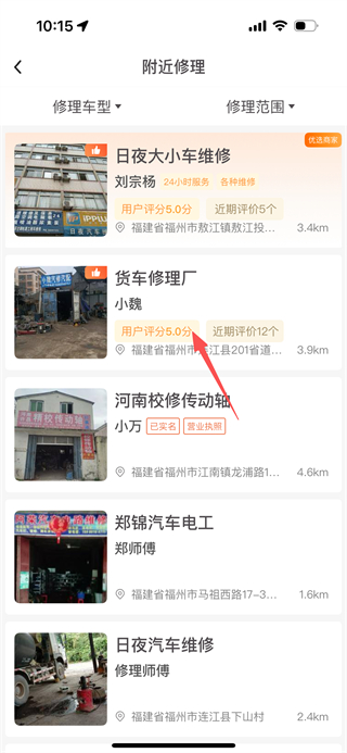 2、在附近修理页面即可查看附近维修店,还可以选择需要的修理厂,进入修理厂详情页面。