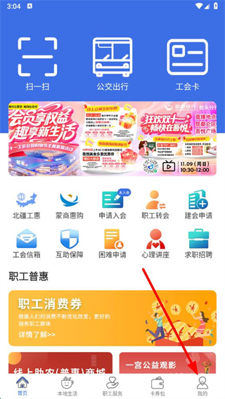 1、在鹿城职工普惠app首页,点击右下角我的进入个人页面。