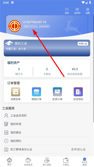 2、在个人页面,点击完成职工实名认证,进入实名认证流程。