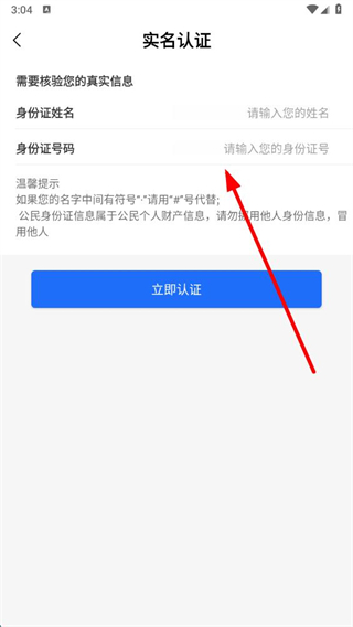 3、在实名认证页面,输入身份证姓名和身份证号码,点击立即认证完成身份核验。