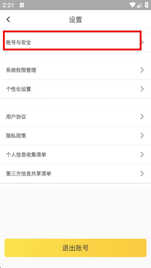 3、在设置界面里,点击账号与安全选项。