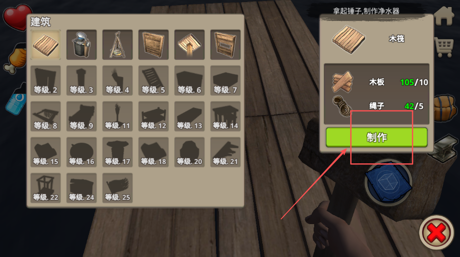 2、建造模式扩建木筏打造个性化生存基地,设计功能区域和防御设施,掌握建筑技巧和布局规划,优化生活环境和安全系数,实现发展目标。
