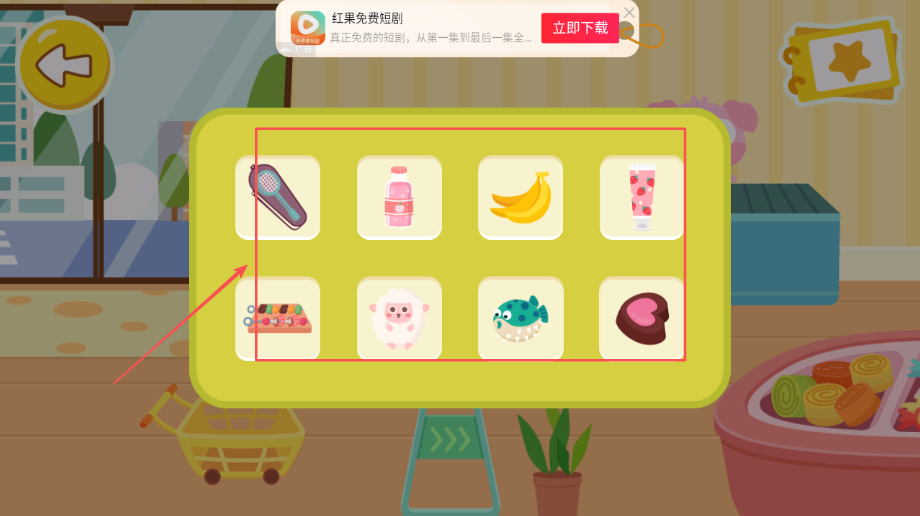 1、进入游戏选择购物清单,根据提示认识不同商品类别和摆放位置,开始购物体验,学习商品分类和超市布局的基本知识。
