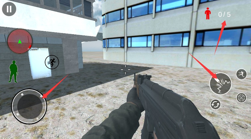4、左侧轮盘控制角色移动,右侧按键负责射击,达成右上角击杀数量即可通关。