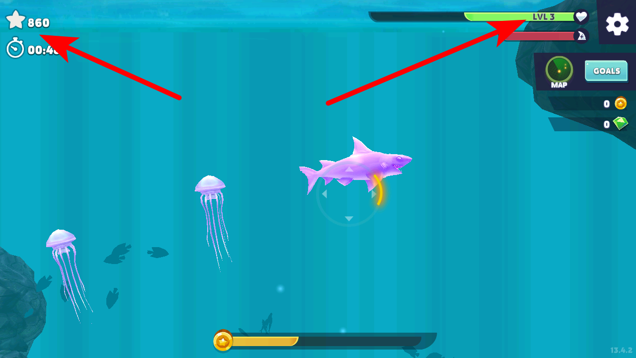 4、通过不断捕食升级鲨鱼等级,提升鲨鱼的能力,同时注意躲避危险生物和障碍物,在规定时间内尽可能获得更高分数。