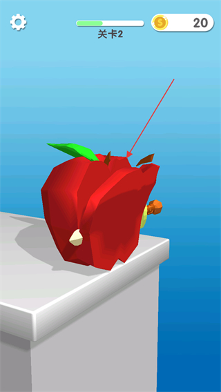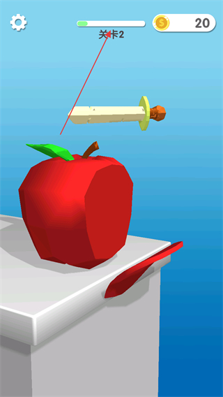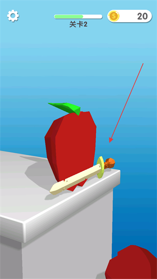 1、在关卡2中,操控刀具如剑向苹果方向移动,准备切割。