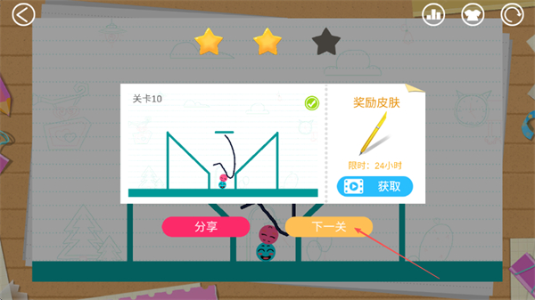 4、通关后可获得星星评价,点击下一关继续挑战,还可获取奖励皮肤。