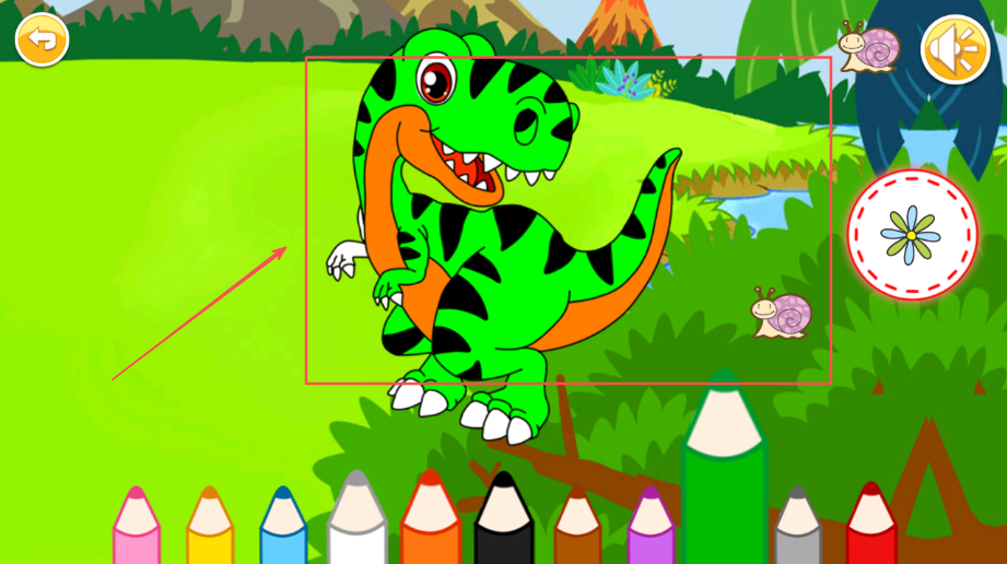 1、首先需要进入游戏主界面选择感兴趣的恐龙图案开始涂色创作体验,通过观察不同恐龙的名称标注和特征介绍来了解相关科普知识内容。