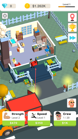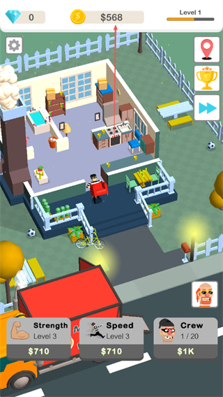 1、操控角色在房屋内搬运家具,通过搬运积累金币。