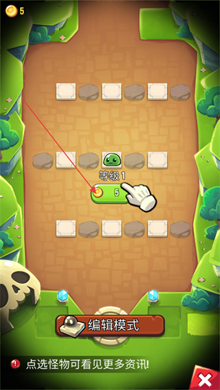 1、在编辑模式下,点击怪物如绿色史莱姆,消耗资源升级如等级1消耗5资源升级,提升其战力。