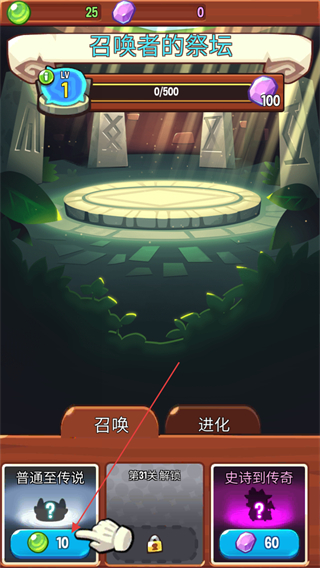 1、在召唤者的祭坛中,消耗10个绿色资源进行普通至传说的召唤。