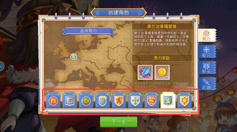 1、进入游戏后首先选择心仪的势力阵营,这将决定你的初始航海路线与盟友。