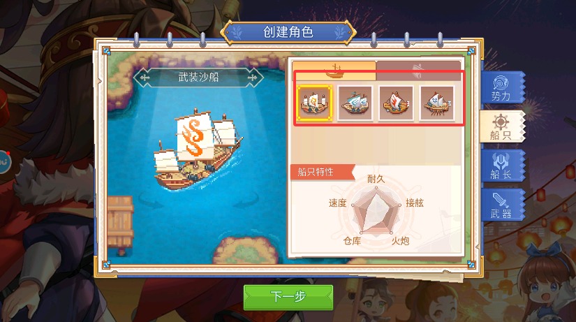 2、接着从各类舰船中挑选武装沙船,作为你探索广阔海域的初始航行载具。