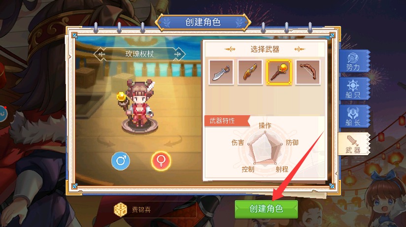 4、最后选择合适的武器装备配置方案,点击创建角色正式开启远洋冒险旅程挑战。