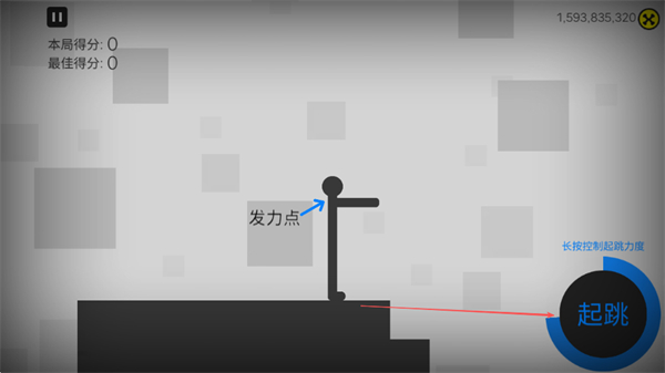 1、长按起跳按钮控制起跳力度,找准发力点让火柴人起跳。