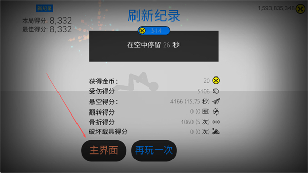 4、游戏结束后,根据空中停留时间、受伤、翻转等情况结算分数,若刷新纪录可获得金币奖励,之后可选择返回主界面或再玩一次。