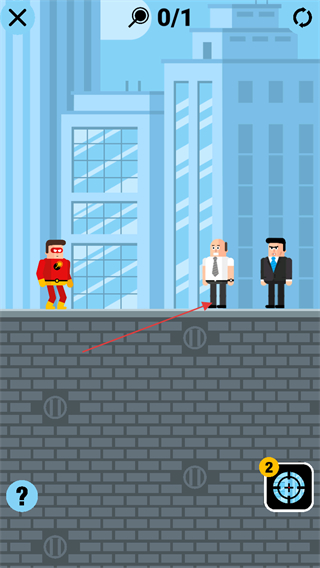1、根据上方0/1的放大镜提示,识别需消除的目标,画出直线连接超级英雄与目标人物。