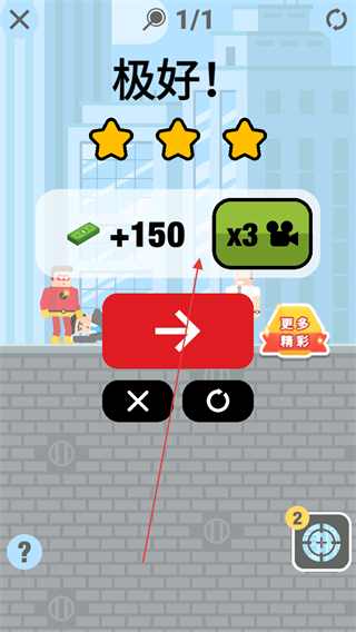 4、关卡完成后获得+150金币奖励,可点击红色箭头进入下一关或观看视频获得3倍奖励。