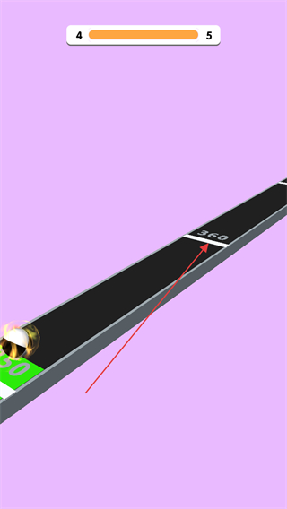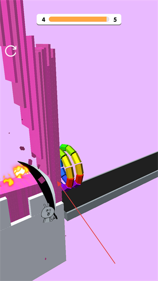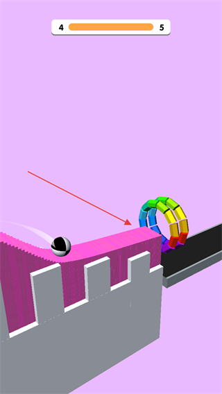 1、操控切片工具切割粉色障碍物,通过切割降低障碍物高度,推进关卡进度上方进度条显示当前关卡从4向5推进。